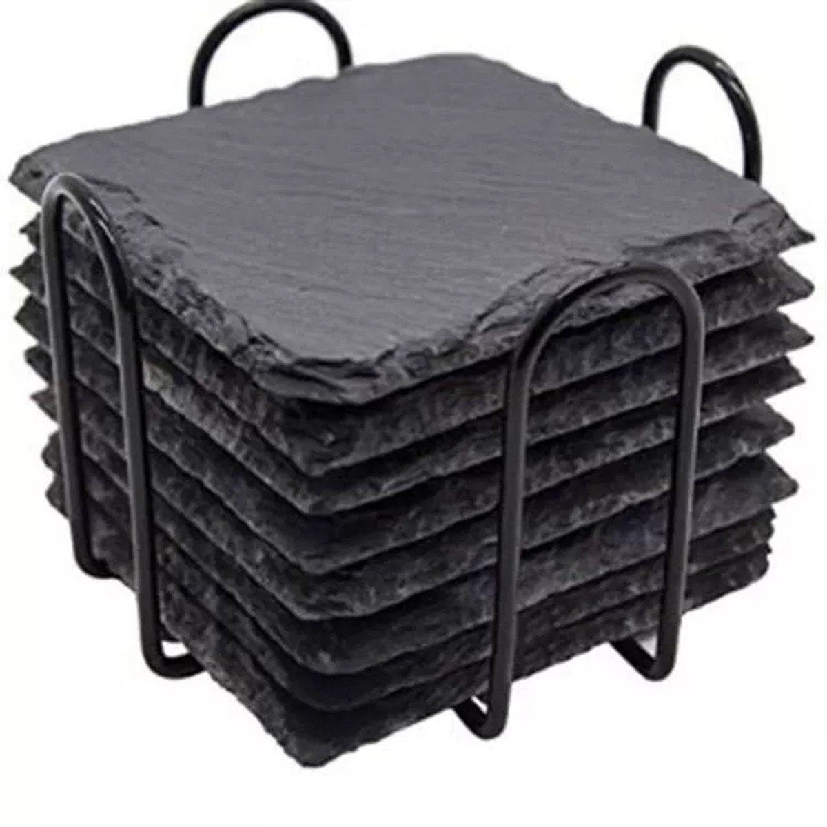 Description:These gorgeous charcoal grey slate coasters are handcrafted from natural stone providing you with a high-end, high-perceived value coaster set. Slate is non-toxic, odorless, & super easy to clean - just wash in water. The metal stand conveniently displays the 8 coasters & keeps them handy for use.