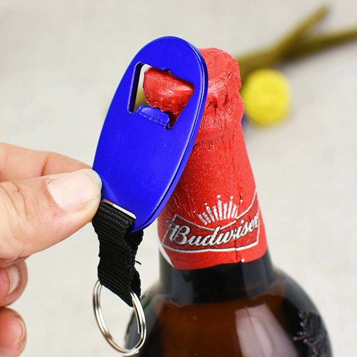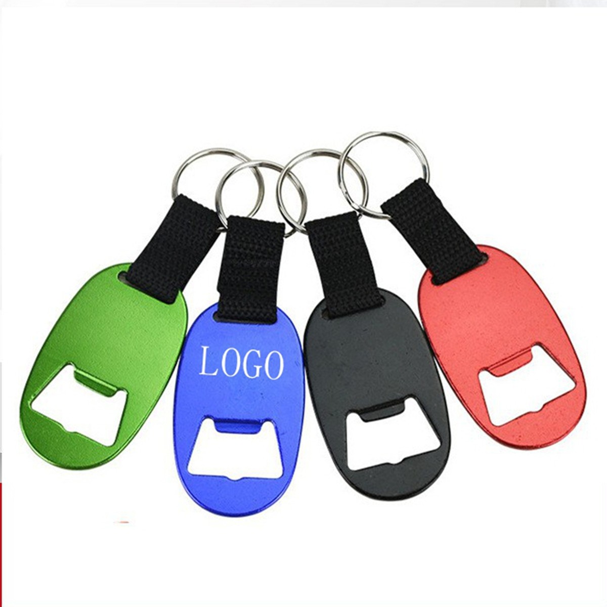 Description:This oval shape bottle opener keychain is made of good quality aluminum metal material with woven web strap. It is a great smart design for a keyring.