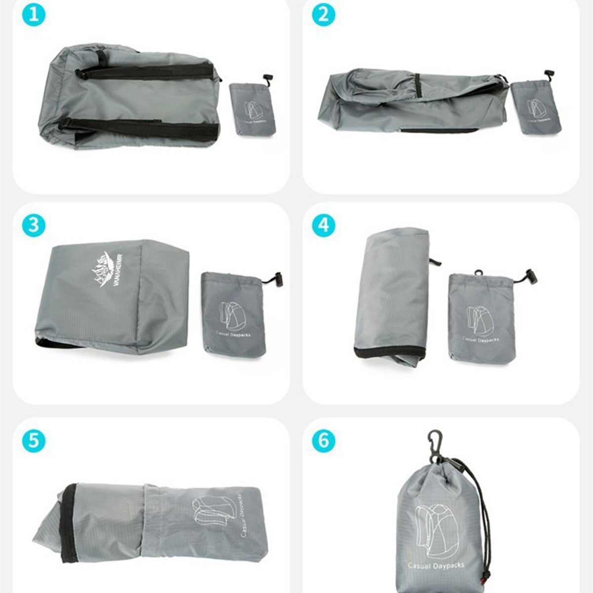 Description: This backpack is made of polyester. Features include one side pouch and a front zipper pocket.It can be easily folded down into a compact size of just 3.5 x 1.1 x 5.1 inches. Multiple colors are available. Perfect for day trips, travel, day hikes, school, camping, and shopping.